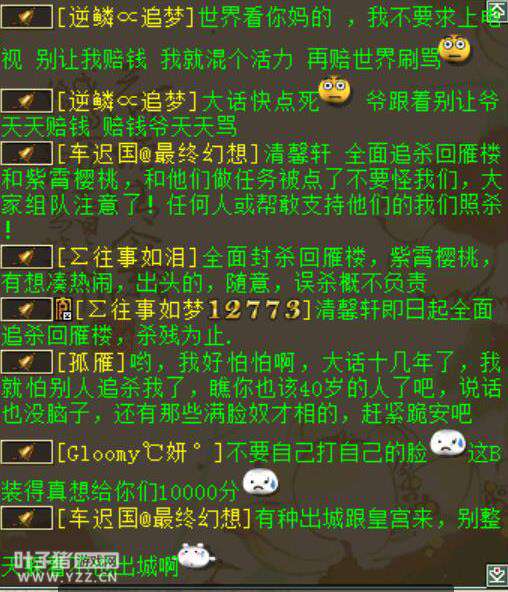 插曲 不好意思本来有一张清馨轩主队偷袭绿水汀队伍的截图,因为这号刚刚在叶子猪论坛建的没法上传,稍后看能不能后补。 次日清馨轩主队组队截杀绿水汀任务队,为此两大帮派闹到皇宫对杀,听说还上了CC30。视频直播的时候各种谣言说的有点恶心了,不再复述。 此事两个帮派皇宫以后,也不了了之。紫霄樱桃 卖号离帮,绿水汀恢复平静。 现状 这些天第一大帮《清馨轩》封帮未成,跑到客服投诉几百人的第一大帮,被一个不知名的《回雁楼》一个队伍杀的没法升级、要求客服帮助处理。 剑侠吃瓜的群众看不到了皇宫的激情,更看不到野外的狼烟,为此特为剑侠吃瓜的群众展现一下事件的基本始末。 我们相信身为服务器排名第一的老牌劲旅《清馨轩》能够在最终幻想的带领下,完成对《回雁楼》的封杀大业。 域外的威胁