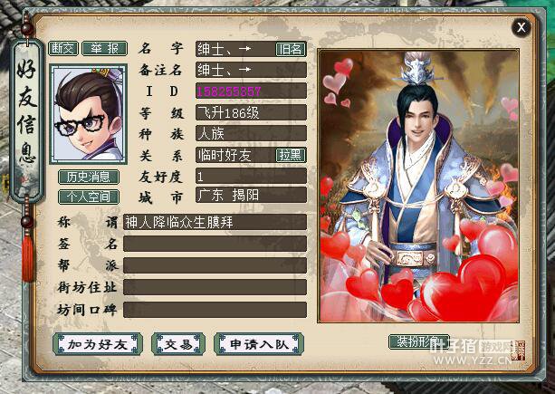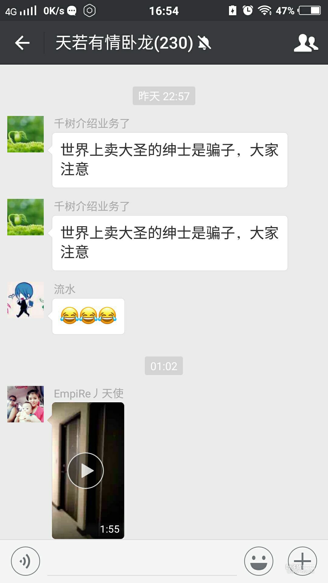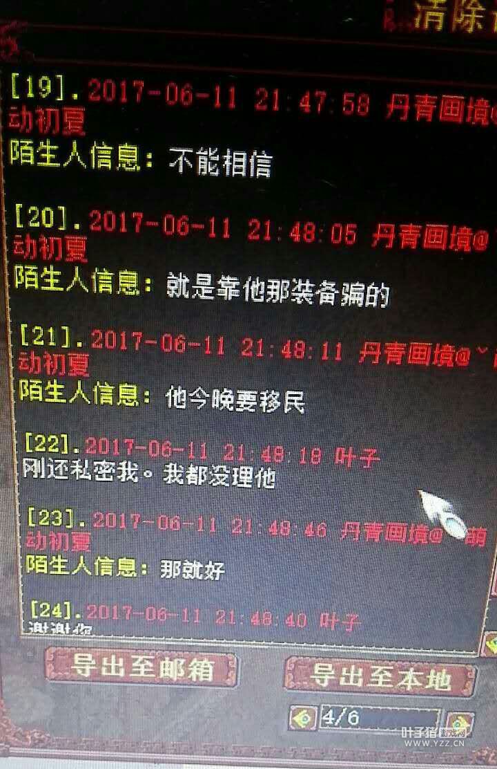 我是天若有情的战且试天下,前几天世界上和铃铛一直有几个人骂一个人,说刚移民过来186男人ID158255357是个骗子,骗了很多区,现在移民到天若有情骗人。骗子刚加帮就被T出帮了。过一会这个骗子已经改名为绅士、→想继续行骗,请大家注意。骗子ID和资料要记住了。 知道是骗子的关系好几天没有帮派收他,我在微信群里看到好多玩家发消息,这个骗子发一堆6阶装备与化无进行诱惑,骗子对玩家说要买东西银行卡限额了,押终极宠和一套乾坤借几千块,说明天就还。我赶快叫玩家不要交易,幸好没有被骗。详见下面图片 骗子诱惑玩家:
