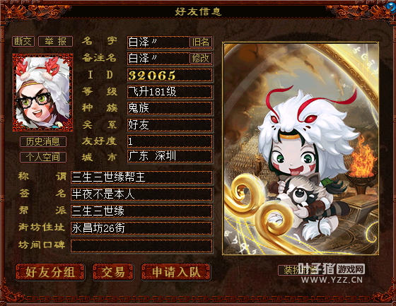 记者莎草子:你们帮兄弟姐妹的心很齐,凝聚力很强。 白泽〃:我有次去北京看兄弟,认识了一个大话玩家,挺聊得来,回去后他直接叫上自己的一帮子兄弟移民到了我们帮,还有波波强,带了25个兄弟移民过来,没要我们出一分钱的移民费,说起这些真的很感慨。 记者莎草子:古语闻“士为知己者死”,虽然我们现实还没那么高的境界,但是游戏里这个还是做的到的,因为相识所以相知,因为相知所以愿意在大话西游2这个游戏里,做一帮生死与共的好兄弟。祝愿你的帮派快乐向前走!兄弟姐妹在这个大家庭里永远亲如一家。 白泽〃:谢谢!在这里也感谢所有三生三世缘的兄弟姐妹~~一直以来帮里的支持。 游戏合影