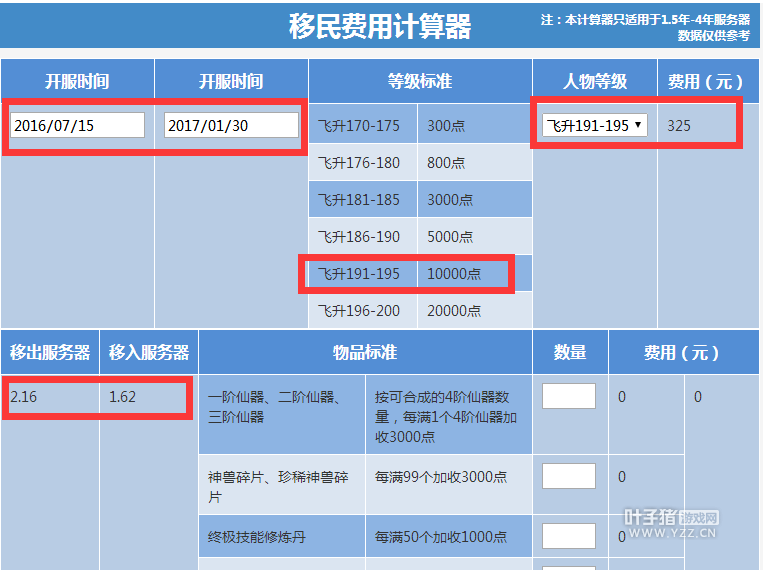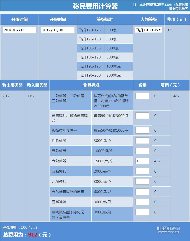 导语:移民费用计算?移民费用如何计算?新移民费用规则是否合理? 今天有个龙城飞将的好友问我想转最近新开移民的沧海潮,他听说现在出了新移民费用,他等级是飞升192级,光这个等级就得掏出10000点点卡了?更别提身上的贵重宝宝和仙器都得额外再付出费用。 我想当时出新移民费用规则时不少玩家都有盯着等级段费用和贵重物品及宝宝的收费表格在看,没留意移民费用规则上的公式了,就拿朋友的等级来举个例子,虽然移民规则上等级段表格标注着飞升191-195费用为10000点,还有个费用计算公式:等级额外费用 = 等级段费用×(0.7+0.5×移出服务器时间-0.9×移入服务器时间) 也就是说朋友虽然是192级,等级额外费用还要以自身服务器开服时间和要移过去的服务器时间进行计算,那么到底应该如何来计算呢? 就拿朋友来举例,我特意去查合服表: 可以看到,龙城飞将服务器开服时间为2016年7月15日,沧海潮开服时间为2017年1月30日,那么这两个时间段的时间应该怎么算呢? 于是我又用计算器进行计算 通过表格查出了龙城飞将转沧海潮服务器的移出2.16移入1.62,再选择朋友的等级,得出的数据为额外等级费用325元。原本朋友说得10000点,表格也的确显示的10000点,也就是1000元,那么真的只是325元吗? 我习惯笔算,费用计算公式:等级额外费用 = 等级段费用×(0.7+0.5×移出服务器时间-0.9×移入服务器时间),直接看下图吧囧 笔算得出的结果是322元,通过移民费用计算器得出的结果却是325元,于是我联系了叶子猪编辑,回答我计算器算出服务器参数没有四舍五入,这就是与我笔算误差的来源。 所以我的朋友在龙城飞将为飞升192级,转去沧海潮服务器并不是表格上的1000元(10000点),而是322-325元(3000多点)。 算到这,移民费用计算器上还有贵重物品及宝宝的计算费用的计算公式和等级的公式一致:携带贵重物品额外费用=携带物品对应费用加和×(0.7+0.5×移出服务器时间-0.9×移入服务器时间) 我先用移民费用计算表算下一把6阶仙器的价格: 移民基础费用就得1000点,也就是100元。总费用会自动加上这个基本费用,数字一目了然了。 这个新移民费用规则针对开服一年半至四年服务器调整的,有的玩家肯定会感慨按这个费用标准来算,一些高端物资的玩家移次民不得花了几万软妹币?贵重物品收费标准也有上限为150000点(1W5元),如费用加和超过150000点时,按照150000点计算,也就是移民费用封顶是1万5千元,超了也按这个算。 最后放张好友的帅照(强行要留念,无视就好) 有小伙伴需要移民计算费用的话会用到的两个工具在此附链接,希望能帮到大家: 移民查询表:http://xy2.yzz.cn/guanzhu/201607/1009024.shtml 移民费用计算器:http://xy2.yzz.cn/jsq2015/ymjs/ [编辑:一笑奈何]