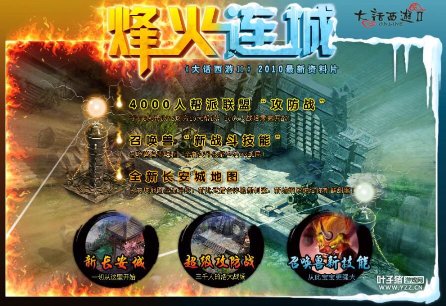 谨以此文献给所有深爱并一直坚守在大话西游2的玩家,让我们和大话西游2一起成长。 在我们携手共同走过的16年,大话西游2一共推出了18部资料片。一部部资料片,见证了我们在游戏的成长,镌刻了我们的青春。 大话西游OnlineⅡ最初登录界面 叶子猪总结下大话西游2十六年以来十八部资料片,希望与大家一起见证她的来历,她的诞生,以及她努力的方向。 大话西游2第一部资料片:再世情缘 历史时间 2002.11.15 作为大话西游2首部资料片,《再世情缘》的推出让玩家梦寐以求的做天成为了现实,崭新的城市洛阳与我们见面,帮派系统逐步趋向完善,并开放一转,经典的一转人物形象:飞剑侠/燕山雪/媚灵狐/逆天魔/武尊神/玄天姬,召唤兽可以转生,合宝石赚钱的巨大诱惑,推动了大话2玩家成倍数的增长。 《缘定三生》开放二转系统,以“取经故事”为蓝本开放新剧情,新增的练功区四圣庄、万寿山、白骨山。新练功区出现11只新的召唤兽:黄金兽、冰雪魔等。与此同时开放了神兵升级系统、鬼王系统、地煞星系统、三界妖王、养育系统。 大话西游2第三部资料片:骑天大圣 历史时间 2004年1月 第三部资料片骑天大圣