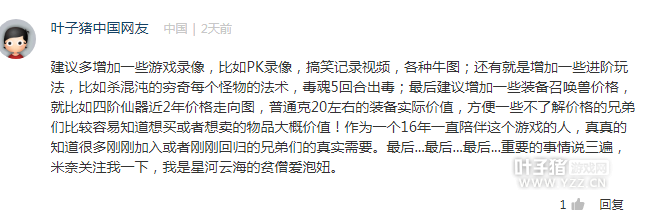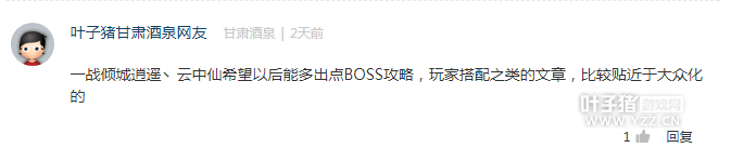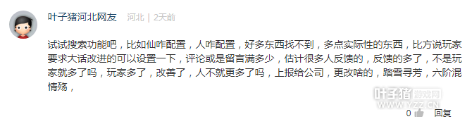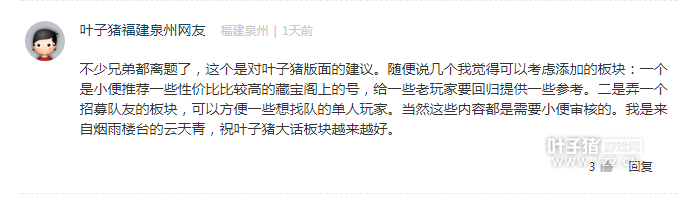 来自烟雨楼台的玩家云天青希望专区能够开设一个藏宝阁版块用来推荐合适的号给回归玩家发展。这个提议不错,不过功能是否能体现我们编辑团队需要慢慢消化一下。至于提到的队伍招募版块,叶子猪一直是有的,还请多看看专区首页的招募版块哦。不过冲你的留言,奖励你100点卡一张,请联系米奈QQ2862221671领取。