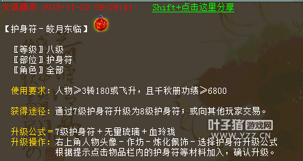 维护之后八级护身符投放,叶子猪第一时间联系了小伙伴上号体验八级护身符,下面跟大家分享下整个流程: 八级护身符说明
