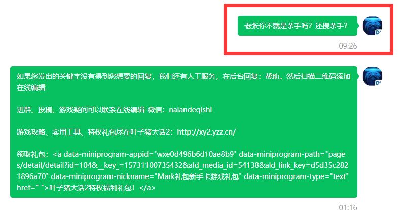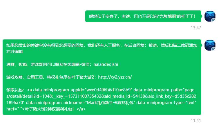 无默契配饰的升级对于大力一族玩家来说绝对是好事一件,也对很多穿着无默契配饰的五开党们带来了福音,加上点粹系统带来的全新属性,相信今后在日常任务时会更加轻松,期待正式服的全面上线! 五、玩家体验感爆棚!叶子猪大话2公众号回复有毒! 一玩家在叶子猪大话2公众号后台回复“杀手”,出来的答案打死都想不到,有毒啊!!! 另一位玩家回复的蝴蝶仙子,也有小编现身真人回复,试问还有谁比咱们的公众号更人性化呢? 有毒,绝对有毒,大家不妨试试,在我们的公众号内回复或咨询你想咨询的问题,说不定真的会中“毒”......(请尽量不要问太多奇奇怪怪的问题,避免小编进入癫狂状态#99) 好啦,今天的大话2新鲜事就为大家带来到这里了,欢迎兄弟们继续踊跃投稿,和大家一起分享你的大话经历,我们下期再见! [编辑:小栗旬]