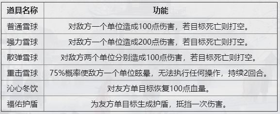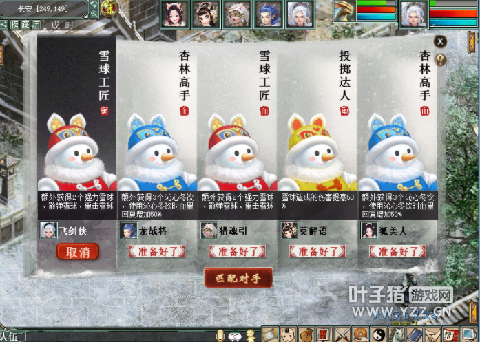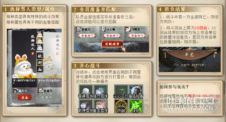 限时·坊间戏雪 活动时间 2022年12月15日-2022年12月28日 周一至周五的每晚19:00-22:00 参与条件 5人组队,角色等级≥未转30级,时间宠≥10级 活动背景 雪落长安,欣喜至极,快与好友组队一起打雪仗吧! 活动场景 长安 活动流程 冬季活动开启时的周一至周五,每晚19:00-22:00,坊间戏雪活动限时开放。 三界少侠可5人组队前往长安瑞雪仙子处(246,147),选择坊间戏雪进入玩法界面。 队伍内每位成员自由选择要变身成的雪人类型与雪人属性。每种雪人类型具有不同的战斗效果,每种雪人属性也各有特色,合理搭配方可克敌。 队员全部选择完毕并准备好后,可以点击匹配按钮,匹配对手。 进入战斗后,各位少侠可使用界面右侧的不同雪球与道具与敌方进行打雪仗(每回合仅可执行一种操作)。 每种雪人至少拥有99个普通雪球、1个强力雪球、1个散弹雪球、1个重击雪球、3个沁心冬饮、1个福佑护盾。 战斗中若一方全部阵亡,则该方判负。 战斗回合上限为10回合,10回合结束时按双方存活单位数量决定胜负。若双方存活数量相同,则平局。 雪人类型 雪人属性 敏:拥有较高的敏捷,较低的根骨,适合先发制人。 衡:拥有中等的敏捷,中等的根骨,适合稳扎稳打。 血:拥有较低的敏捷,较高的根骨,适合后发制人。 道具说明 活动奖励 1、每日前三次对战时可获得经验奖励,获胜可获物品奖励,三次对战后无奖励。 2、累积获胜40次,可获得功绩雪仗高手(若2021年元旦活动已获得此功绩则无法再次获得)。 物品奖励包括 |