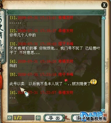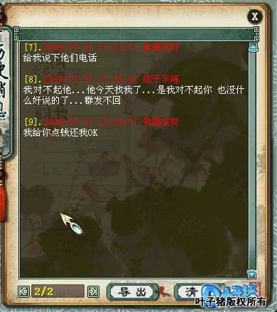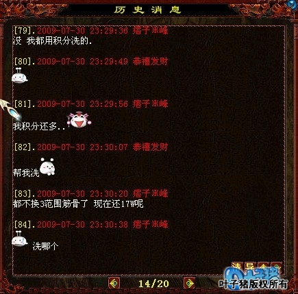 这是骗子大号和跟大号的对话图。 下面是我跟此事知情人:★飞雪★的对话。 我简称记者,飞雪简称飞雪了。 记者:你好。我是叶子猪记者emilywang。 飞雪:你好。 记者:请问,你知道恭喜发财的事吧? 飞雪:知道。被朋友骗啦。 记者:那你把你知道的情况跟我谈谈吧。 飞雪:他把宝宝给了那个痞子峰,让痞子峰帮他洗点。宝宝拿过去之后那人就下线了。为这事发财还报警了,但是骗子始终未把宝宝还给他。 记者:你们都知道发财把宝宝拿给他洗? 飞雪:知道。这件事是事实。不信去问GM。GM那应该有交易记录。 记者:。。。为什么当时不留张截图呢。 飞雪:如果是GM的话能查的吧?起码这是价值5000RMB的东西。GM不会不管的吧? 记者:你们有去主页申请物品找回吗? 飞雪:请问记者。如果此事找GM去解决的话?你认为到最后会是怎么样? 记者:。。。我不是GM 飞雪:我经常去叶子猪看。记者职业也不好做吧。请问你们记者报道商人的消息吗? 记者:有的。谢谢关注叶子猪。请问你,他们交易宝宝时你在不在现场? 飞雪:不在现场,我只知道宝宝的确在骗子手里。 记者:嗯,你也认识痞子峰? 飞雪:我是商人。跟他打过几次交道。这区大部分事我还是知道的。 记者:那你平常觉得痞子峰这个人怎么样? 飞雪:交情不深。无法判断。但是见利忘义的也不少人了吧。 刚在我采访时,骗子上线了,但我始终未联系到他!大家看看发财跟痞子峰的对话。 ![]() 对话记录