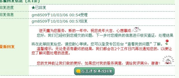 3月5日学习雷锋纪念日,福星还发了任务用品雷锋帽; 携带雷锋帽在物品栏,杀妖是得到更多的经验; 截止到当天24时,全区杀妖最多的玩家奖励“活雷锋”称谓; 确定这消息之后,4开小号,带了两车组队飞行符; 从5日凌晨奋斗至5日24时,系统公告出来大失所望; 我小号的杀妖次数,为了保证我得称谓,特地让小号都少我几次!保证我是最多的! 客服专区的反馈结果。 我40个小时连续作战了,很困了,已经没心情再继续和他纠缠了,但愿给我一个好的答复! [编辑:星陨]