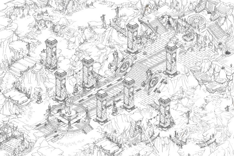 大话2是一款经典的写实中国风2D网游,她的经典不仅体现在内容丰富好玩的回合制玩法上,精致细腻、饱和以及质感非常的画面同样也是大话2成就经典的重要原因之一。 小编通过走访大话工作室,得到了大话2场景美术第一手的场景制作过程资料,这里与各位玩家分享,走近开发组: (以“魔王窟前殿”为例) 1,魔王窟前殿的玩法需求 混天大牢地处魔王窟西南(魔王窟是上古时期平天大圣牛魔王及其兄弟七大圣反抗天庭的根据地),是魔王窟的唯一入口,此处有一个坚不可摧的魔王窟大门,门外有许多小怪在巡逻。另外,地下还埋藏着一个上古时期遗留下来的无坚不摧的龙神大炮,玩家可以利用这个龙神大炮轰开大门。 |