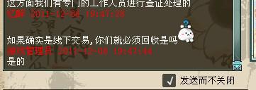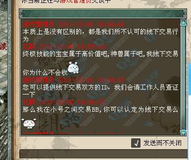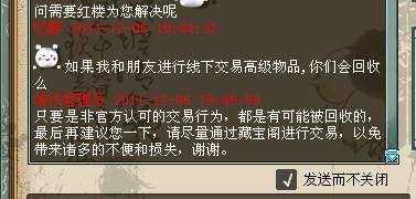 大家请看图,我买朋友DHB,成功交易第2天,系统以我的DHB是线下交易为由,把我的DHB全回收了,完了我进行申述,系统管理员是给我这样的回复,说明咱们交易什么东西,除了进行藏宝阁,不管你什么方法,系统都会进行回收这就是所谓的玩法守则。