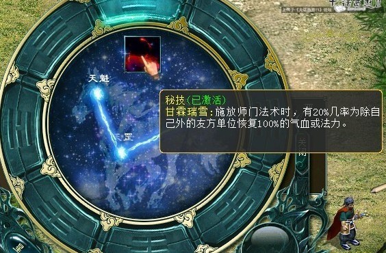边境自动防御了108回合,隐身触发了2次,每次隐身1回合(不含隐身触发的回合), 还真是2% 的几率感觉用处不大,不过其他天罡星秘技也不容易凑,天速星--天空星-天暗星-天佑星这组天罡4~5开刷起来很容易,就当触发隐身作为意外惊喜吧。 二:天罡星秘技之秘技甘霖瑞雪(回法)初探