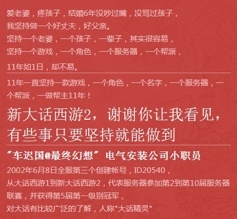 >>推荐阅读:经验之谈:玩家总结飞升后需注意的17项 一款游戏,一生朋友!我们来自全国、乃至世界各地,是大话西游2让我们相聚在一起。现实中我们有着各自的圈子,各自的生活,各自的工作,各自的故事……游戏中我们不分彼此,一起升级,一起PK,虽然有屌丝与高富帅之分,但我们在大话的世界里都有自己的一片天地!十一年的大话生涯,有喜有悲,有苦有甜,大话陪伴着很多人走过了他们人生最重要的十一年。感谢大话2让我们看到自己和他们的故事! 玩家信息: "GuccI宝贝" 职业模特 2012年度全服战神王 全年水陆积分全服第一名 玩家感言: 新大话西游2,谢谢你让我看见,另外一个世界中的自己! 玩家在大话中: 沉浸在大话中,已成为放松自己的唯一方式, PK中的见招拆招让我找到了更多生活的乐趣, 现在有自己的队伍,享受和队友并肩战斗的感觉。 玩家在现实中: 镜头前的只有迷人的10000次微笑, 镁光灯下10小时的妖娆, 看似光鲜亮丽,却不知有多少属于自己, 疲惫一天回家后才能有自己的生活。 《新大话西游2》鉴宝阁活动参与地址:http://xy2.163.com/xxy2/jbg/ 玩家信息: "春绿江南@血魔女" 网店女掌柜 角色创建时间:2002年9月15日 等级已满,修正未满,一共战斗166893次 玩家感言: 新大话西游2,谢谢你让我看见,这世上真有一种习惯叫不离不弃! 玩家在大话中: 11年来唯一不变的是桌面大话西游的方块图标。 上学时,偷偷的玩,上班时,在休息时玩, 如今,在孩子睡着的时候玩。 玩家在现实中: 11年的变化很多,同学成为了男友,现在叫他老公, 曾任职的公司已用一只手数不过来, "店家"是现在别人对我的称呼, 去年有了孩子,照顾他感觉很幸福! 《新大话西游2》鉴宝阁活动参与地址:http://xy2.163.com/xxy2/jbg/ 玩家信息: "车迟国@最终幻想" 电气安装公司小职员 2002年6月8日全服第三个创建帐号,ID20540, 从大话西游1到新大话西游2,代表服务器参加第2到第10届服务器联赛,并获得第5届第一级别冠军, 对大话有比较广泛的了解,人称"大话精灵" 玩家感言: 新大话西游2,谢谢你让我看见,有些事只要坚持就能做到! 玩家在大话中: 11年一直坚持一款游戏,一个角色,一个名字,一个服务器,一个帮派,一做帮主11年! 玩家在现实中: 爱老婆,疼孩子,结婚6年没吵过嘴,没骂过孩子, 我坚持做一个好丈夫,好父亲。 坚持一个老婆,一个孩子,一辈子,其实很容易, 坚持一个游戏,一个角色,一个服务器,一个帮派, 11年如1日,却不易。 《新大话西游2》鉴宝阁活动参与地址:http://xy2.163.com/xxy2/jbg/ 玩家信息: "浅水里の波妞" 某工科院校毕业女青年 琉璃仙境玩家,安静游戏,默默升级,一生战斗100140次 玩过还算小资的号,如今长发及腰 玩家感言: 新大话西游2,谢谢你为我晦涩无聊的学习生涯,平添一抹重彩,让我充实走过大学四年。 玩家在大话中: 回宿舍,玩大话,算是在学校唯一消遣, 室友永远也不会明白,对着屏幕傻笑的我, 因为我有幸在曾被称为南少林的校区里, 邂逅一份独一无二的大话爱情。 玩家在现实中: 繁琐的数理统计,复杂的结构力学,算到头昏眼花脑袋发胀, 生活只在实验室与宿舍间往复,单调的有些无聊。 《新大话西游2》鉴宝阁活动参与地址:http://xy2.163.com/xxy2/jbg/ 玩家信息: "提着毛驴来赶集" 山东寿光化肥门市部经理 哪咤闹海玩家,人称"乡村爱情" 游戏中的24小时便利店,日流水50000000DHB 玩家感言: 新大话西游2,谢谢你让我看见,只要认真付出了就肯定有收获! 玩家在大话中: 天天下乡的生活,再干三年我就不干了, 准备在人民商场开个东北饺子店 我低价进高价出,不仅在生活中也在大话2中, 卖了5年化肥玩了5年大话 玩家在现实中: 卖了5年红日艳阳天化肥了,连刘能都穿有艳阳天的短袖, 虽然每天下乡跑点儿,吃不好还费鞋费唾沫, 但每个月能挣一两万,对我们县上来说, 我钱挣的多,我很骄傲! 《新大话西游2》鉴宝阁活动参与地址:http://xy2.163.com/xxy2/jbg/ <<<点击进入大话西游2论坛讨论>>> [编辑:no魂断蓝桥on]