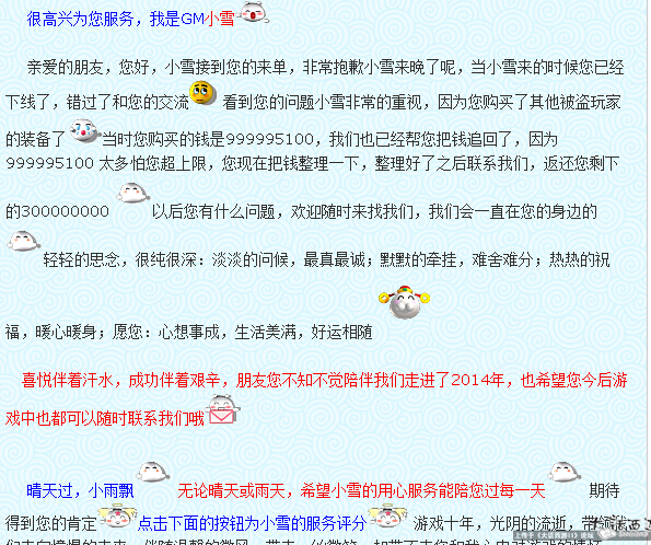 所在服务器一战倾城,看到有人卖四阶仙器扇子,咨询后,觉得可以以10E2000W买,综合比较了一下价钱感觉也相差不大于是决定:先10E交易完,我再给他2000W。 相关截图: 随后这个物品直接被找回了,看来见证也没用了。钱现在再退回7E,稍候再退3E,总共10E,剩下2000W,没着落了。 我还会再次申诉,上面的图说的很清楚了,2000W属于交易仙器的钱,谢谢广大好基友的关注和支持。 <<<点击进入大话西游2论坛讨论>>> [编辑:紫幻冰子]