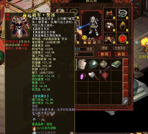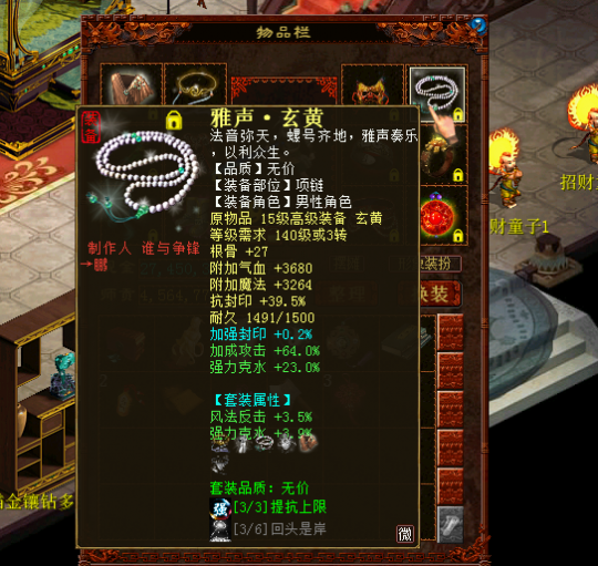 六,项链方面,很多朋友朋友说大力男鬼,非常简单,四节仙器大力项链,大力鞋子,这种堆出来的大力,抗性只能说一般。没错楼主还是选择加成带克项链,项链能抗40人法,如图 七,衣服选择方面,衣服主要用来调整整体抗性,但是楼主赋予衣服跟重要的使命,召唤兽支援,大力在PK过程中,根本没时间让你去招宝宝,只要没被情网上,你就使劲砍,砍火力宝宝,卡男鬼敏,砍女魔,等等,所以必须配备高级支援,若是没有,配个低级支援,也是非常乐观的,土豪一般都是用六节高级支援男鬼衣服,我这里也是刚刚入手一件男鬼衣服,我花了很大的血本,也是我很满意的一件衣服,如下图。 这件衣服,底子抗挺极品,炼化克水加敏,带高级召唤兽支援特技,我找藏宝阁一个朋友谈了好久,也是花了大大大大大大大血本才收到手,在这里感谢下卖我衣服朋友。