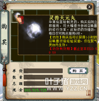 灵兽天元丸的效果将于每日24点清除(无法跨天保留),还请各位少侠合理购买自己所需的数量。