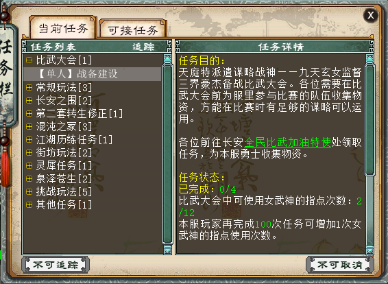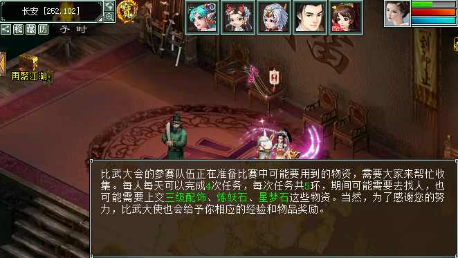 新资料片《万兽有灵》上线之后,比武大会全新改革,除了规则有所变动外,额外增加了一个“女武神指点”玩法,时间就在比武大会当周的周四0:00---周五23:59。 柒柒等着周四0:00兴匆匆体验了下“女武神指点”,为小伙伴们分享全流程和奖励,总体来说这个任务非常简单,全程跑给NPC东西就有经验。 每个玩家可以完成4次任务,一次任务就是5环,等于是要跑20环任务了。由于每环NPC都需要物品,所以身上需多备足三级配饰、炼妖石、星梦石、内丹精华、血玲珑、九彩等 女武神指点 活动时间:比武大会开启当月的第二周周四0:00---周五23:59 参与条件:人物等级≥30级,时间宠≥10级 这是单人任务,到长安擂台找NPC领取 |