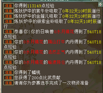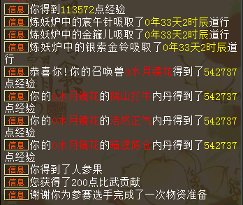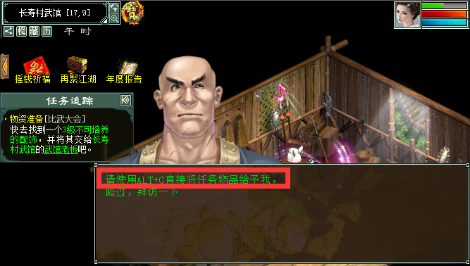 维护之后柒柒上号依然提示物品不足,但是多了一个提示,可以直接Alt+G给NPC物品! 等于一次单人跑5环,每次有10万+经验,做完有200点比武贡献和随机一个。 接着柒柒去跑第二次单人,说明下每个NPC需要东西都是对话就完成的,但是这次又遇到了长寿村武馆的武馆老板无法直接对话给东西,说明下每个NPC需要东西都是对话就完成的,只有这个NPC需要手动给。 第二次单人五环,200点比武贡献+随机(人参果)