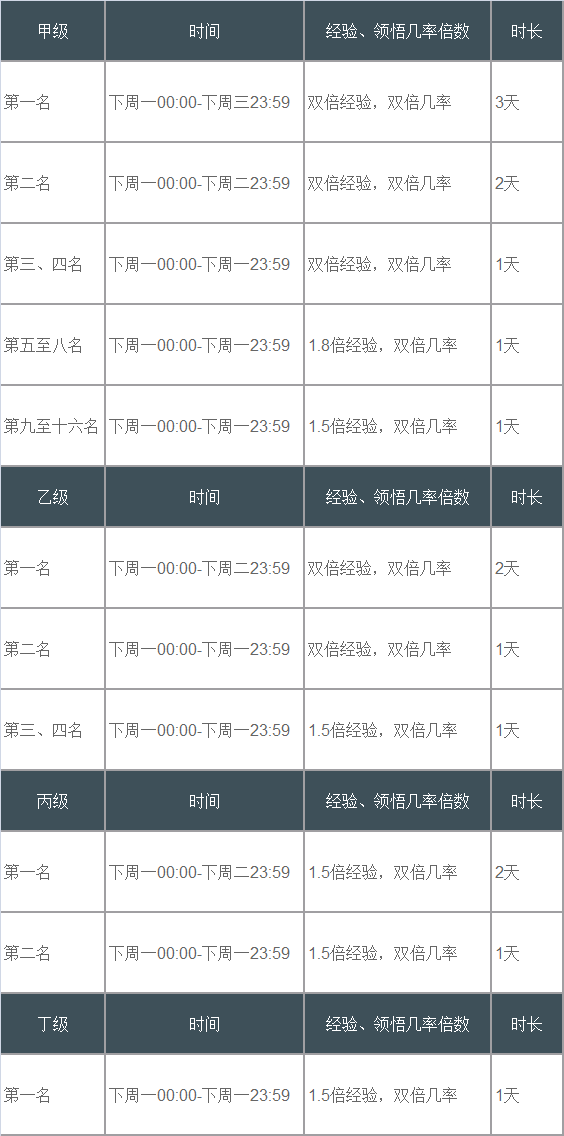 备注:阿三、小鬼、天庭、鬼王、修罗任务、域外风情获得经验加成,其他获得经验的途径不受此影响。 3、特效设置: 比武大会的优胜服务器在服务器选择界面会有专属特效。 4、天宫寻宝: 甲级第一名服务器的参赛ID可以挑战BOSS“二郎神”,挑战成功后全服可开启“天宫寻宝”的活动。 5、称谓奖励: 代表本服参加跨服比武的队伍,在该服务器的全部比赛结束后,能获得比武大会的特别称谓奖励。 玩家切换此称谓时,能够获得一种稀有变身效果。 冠军:年 亚军:范式之魂 季军:浪淘沙 成员:龙马 以上称谓均是变色效果。 称谓截止下次比武前有效。 注: 1.仅参与过跨服比武的玩家能够获得此称谓。 2.仅甲级前4服务器玩家的称谓带有称谓特效。 6、比武奖章奖励: 每位参加比武的成员,根据服务器的比武成绩,均可获得比武奖章,通过比武奖章可自行兑换自己需要的奖励。 历届甲级比武大会冠军回顾: [编辑:一笑奈何]