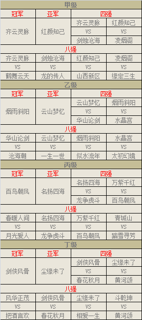 群雄争霸,叫武林英雄知我剑锋之利! 烽烟四起,让世间豪杰尊我天下第一! 让我们以最热烈的掌声恭喜本届(第69届)天下比武大会四个级别的冠军: 甲级冠军:齐云灵脉 乙级冠军:烟雨斜阳 丙级冠军:百鸟朝凤 丁级冠军:剑侠风骨 在山西新区连获五连冠后敏队清号,本届比武大会山西新区只入八强,获得第一的是齐云灵脉,第二红颜知己,看来想打破太初幻境比武七连冠的记录还需要很漫长的时间。 第69届比武大会总决赛精彩视频: 第69届比武大会名单: 比赛奖励: 经过硝烟弥漫的天下第一比武大会后,还有着不菲的奖励赠与各位英雄们! 1、座驾奖励: 宝驹配英雄,何不天涯纵横! 甲级第一给每个ID奖励时效为30天的5人座驾-太音 乙级第一给每个ID奖励时效为15天的5人座驾-太音 丙级第一给每个ID奖励时效为15天的5人座驾-太音 丁级第一给每个ID奖励时效为10天的5人座驾-太音 2、优胜服务器额外奖励 部分服务器将在天下第一比武大会结束的下周开始获得相应时间的升级经验和召唤兽领悟几率提升奖励。