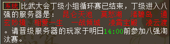 比武大会丁级小组循环赛已结束,丁级进入八强的服务器是: 昆仑天池 莫愁湖 渚碧岛 通玄妙境 相爱一生 一战倾城 凌霄宝殿 凌云渡 [编辑:wei]