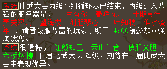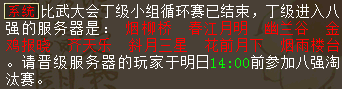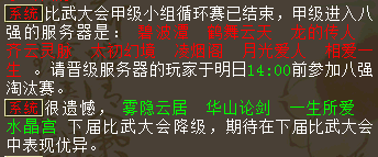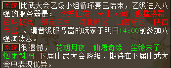 大话西游2第49届天下第一比武大会的小组赛已结束,下面公布四组的八强服务器。 期待明日下午2点的8强淘汰赛,叶子猪与你们不见不散。 比武大会甲级小组循环赛已结束,甲级进入八强的服务器是: 比武大会丁级小组循环赛已结束,丁级进入八强的服务器是: 烟柳桥 春江月明 幽兰谷 金鸡报晓 齐天乐 斜月三星 花前月下 丁级八强