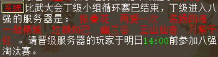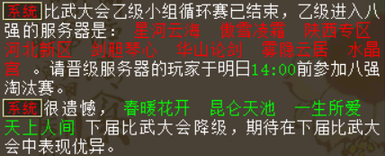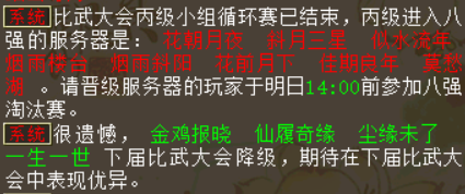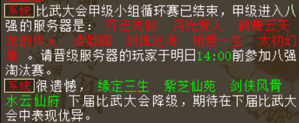 大话西游2第50届天下第一比武大会的小组赛已结束,下面公布四组的八强服务器。 期待明日下午2点的8强淘汰赛,叶子猪与你们不见不散。 比武大会甲级小组循环赛已结束,甲级进入八强的服务器是: 比武大会丁级小组循环赛已结束,丁级进入八强的服务器是: 报春花 再爱一次 名扬四海 一战倾城 红颜知己 幽兰谷 云山仙音 万紫千红 丁级八强