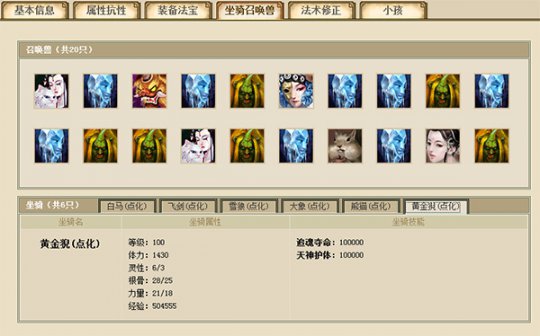 坐骑全部已点化,号上带着二十个宝宝!究竟有些什么样的宝宝呢?下面与大家一起进行针对男人的配置展示评估下!