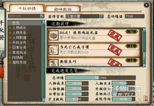 作坊其实用的蛮少,都是自用,看我的体力就知道啦。 7598的功绩够用,最早玩为了冲4800功绩都是靠买神秀堆积起来的,所以很多免费功绩是没有刷的。下面展示下神秀,尽管捐过不少时装,玩女角色还是够用的。 天赋点满,法门现在是坚持点10次吧,不PK没必要浪费钱。 我第一套修正3世男魔,第二套修正忘了,好像是男魔+男魔+男人?很早前因为PK玩的是男鬼,换了好几套修正了。 法术熟练度也不用担心 关于套装,收录的是霄汉、寒鸦、残梦、青鸾、雅声、毗卢,话说霄汉寒鸦雅声这些全是最初玩时竞拍下来的,自己不怎么会刷魔王也不爱刷,回想都是泪 现在有时会跟朋友刷刷魔王吧,刷的虽然不是很多,没有收录的套装齐全我列举一部分吧:红泪、白骨、兰心、六芒、腾蛇、燃灯、国色、青龙、太皓、灭神、凤鸣、孤鸿(差一件,收录用灵修值激活就好,我的灵修值够用) 再看看我现在用的星盘和法宝 以上基本是空号的情况了,相信大家练号都知道练号不易了,作为游戏小白,我很尽力打造我的号了。以下继续分享下号部分物资情况,完全按照任务号打造的。