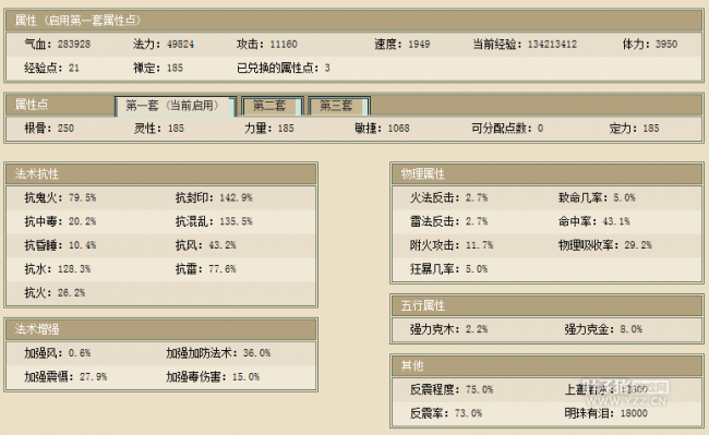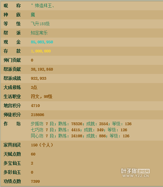 这是四上一个飞升185级女魔号,身上有8000多万,帮派贡献也有3000多万哦,帽子衣服项链作坊,满天赋,功绩为7399,看得出来是个小土豪,地宫有4710,师门积分也有20来万。 我们下面来看看他的人物属性图: 人物属性