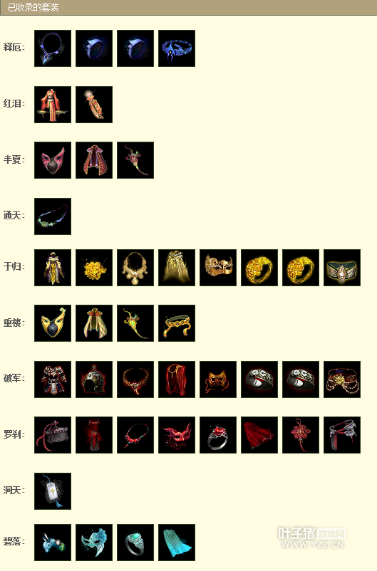 女魔武器衣服和项链都是5阶仙器哦,OS也用的5J,还有神兵这些,后面我们详细看看,继续看下收录的套装。 收录的套装情况