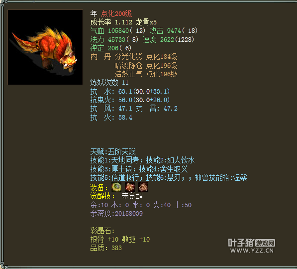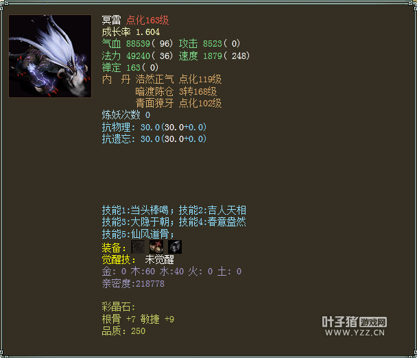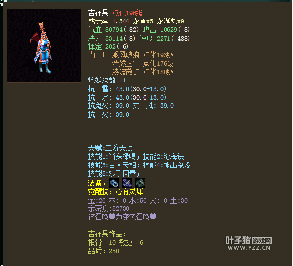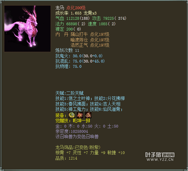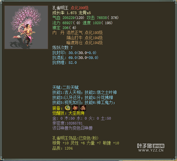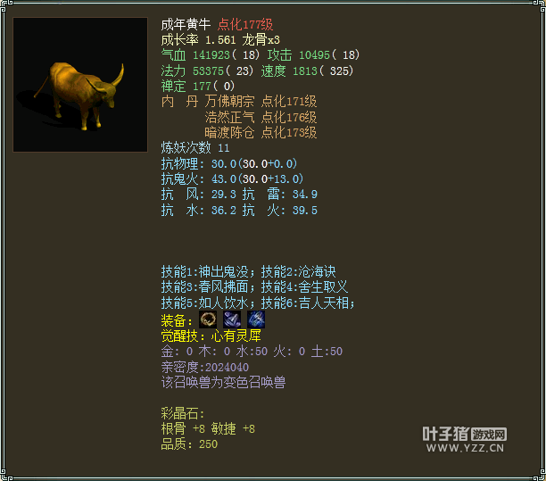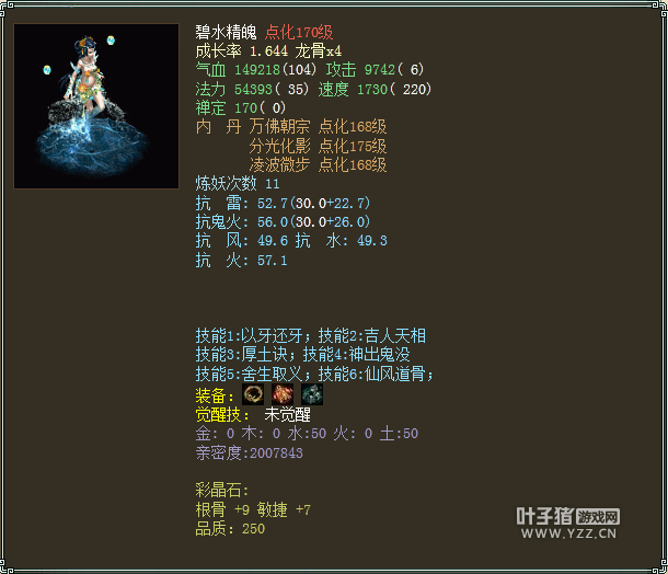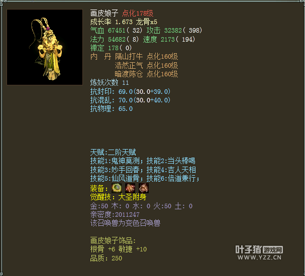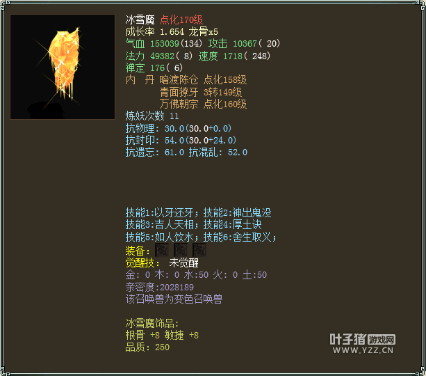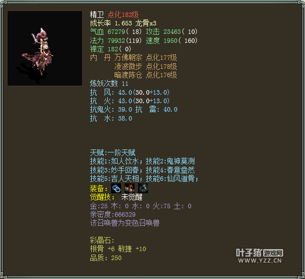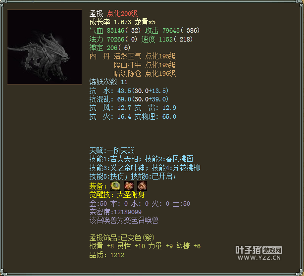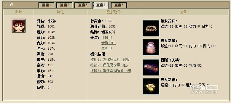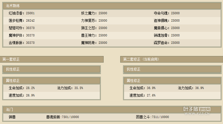 这个女魔号应该是个老号了,第一套修正是没有法满转生的,所以烧了第二套法术修正3世男魔修正,需要其他修正可以拿钱到NPC那转换的。法门点的也满高的,双7500,得不少银子和经验,下面我们来看看他培养的孩子。 评价5031孩子展示