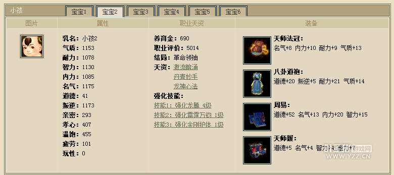 法门选的是破壁,9591和1W的熟练度,都差不多全满了。点的是水法天赋,第一套三世男人修正,第二套是3世男魔。 评价5074的孩子,亲密593,孝心753