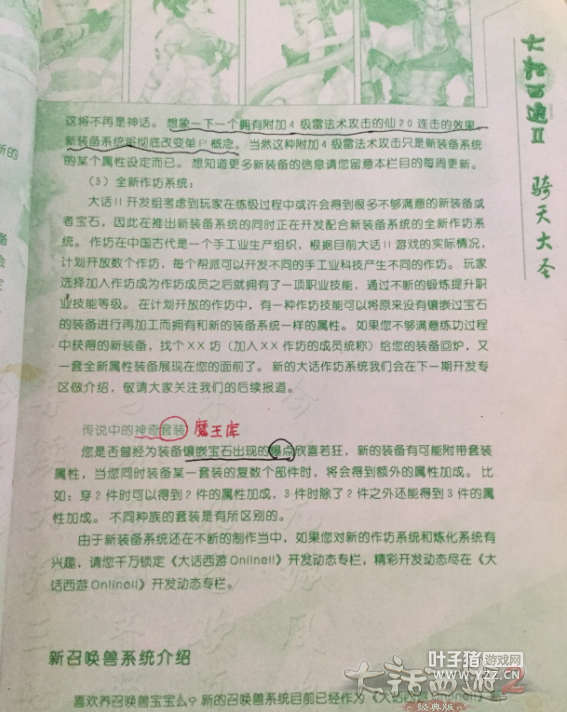 3.玩家xy2@272116693分享 最近我找回了我曾经的记忆,小时候和小伙伴在一个院子一起玩耍,大家吃完晚饭出来玩的时候都会吹嘘自己在大话西游中的游戏经历。 最初我是个小白,什么都不懂,但是为了在小伙伴面前表现,就一直在思考怎么变强。在书店就发现了这本攻略书,当初是借书卡先借来看的,发现需要研究的东西太多了,所以就去说书丢了,最后赔钱,哈哈。 这本书我和我哥哥研读了好多遍,发现了很多新鲜的东西。最初只是知道按照攻略来做,这样就比其他小朋友厉害了。后来发现攻略都学的差不多了,这时候就开始自己慢慢的补充有些内容,需要自己研究。再后来就是考虑哪些是书中写到了但是没有开发出来的内容,比如说传说中的套装;召唤兽技能;4级雷法20连及到现在都没有出来的嗜血犬等信息,最后再回书中找出来标记下。 这本书带给我很多的信息和和在小朋友们面前吹嘘的资本。这本书以前翻阅次数太多了,已经破旧不堪,但是却是陪伴我多年的东西,现在有时间我还是会翻阅下,怀念以前玩大话的那种研究精神还有一起玩耍的小伙伴。 |
