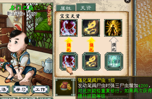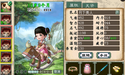 号上自带1个名门的孩子,强化天资还行,现在凑合着用也不错。 然后关键是号上还有1个16岁多点的孩子,我正在养,我仔细算了下,到结局时除了到的外其他属性全部能上1120点,铁定是神结局的,不过想把强化天资弄起来起码得搞好几个月。 套装