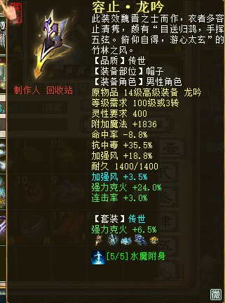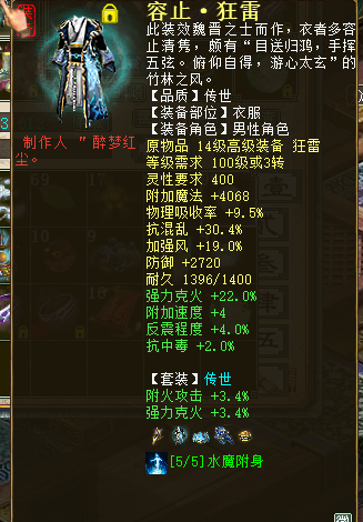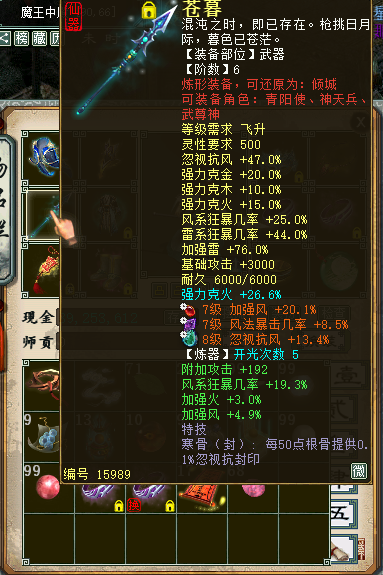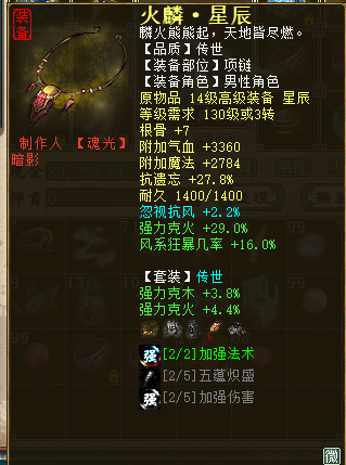 今天给大家展示一期传世容止大炮的配置,携带6阶仙器,容止配上火麟,装备也是非常极品哦,发给大家参考下。 主人是这么说的: 这个底子是一直自己玩的,细节就是每天刷魔王窟然后做日常搞师门赞的合石头。 GM还是挺几率我的,不到2万灵修就细出了克火5,6,7.搭配这套装备在格子找了很久装备反复比较后觉得容止克火还得从细节搞,克火太高强法低了也不行。 现在还差个6介仙器衣服带克火18以上的,还差2个石头,石头和衣服搞好的话强法进战斗能到116克火355狂暴几率100程度40.6忽视77.5. |