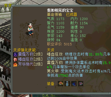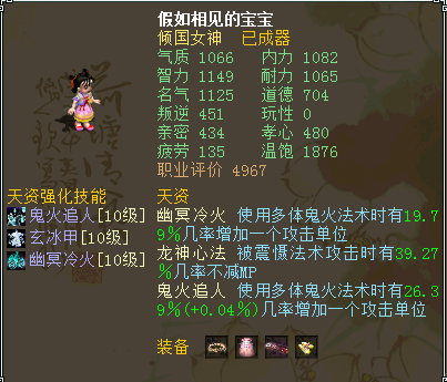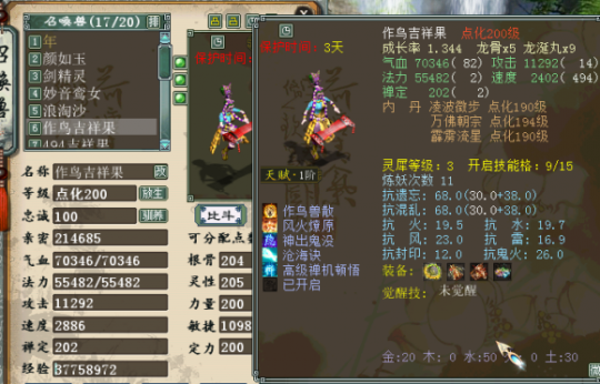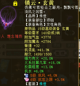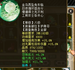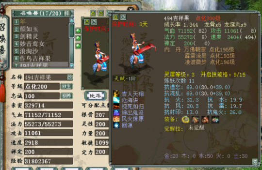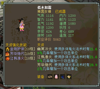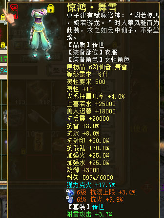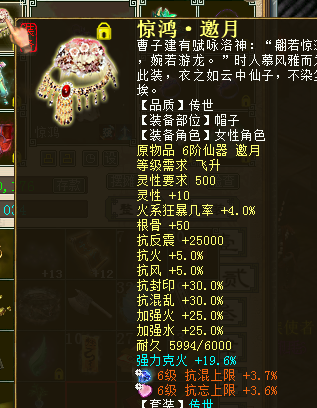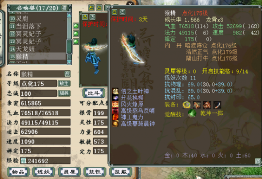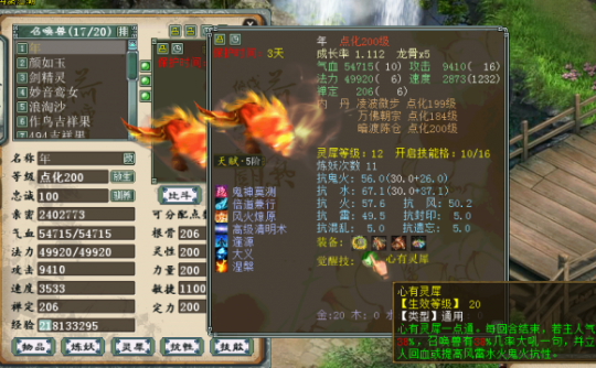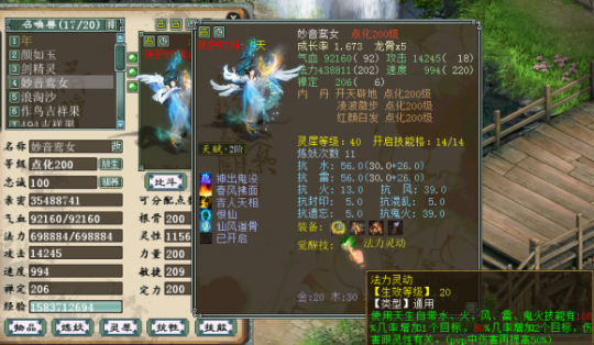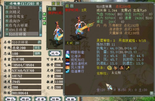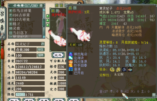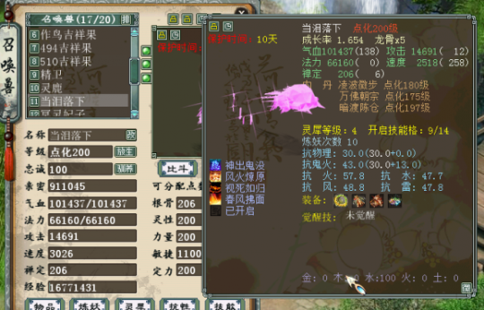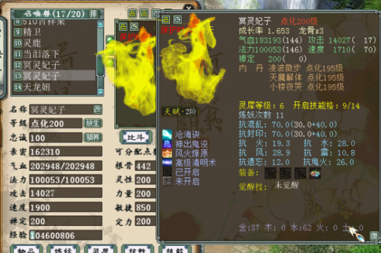 玩火克火女仙的玩家不少,但像今天这位拥有如此给力的配置,如此细节的雕琢还是比较少见的,下面就为大家展示一下由顶尖PVE高手打造而出的火法仙! ![]() 属性展示 ![]() 六阶武器,炼器给力 ![]() 六阶套帽子 ![]() 六阶克火衣服 ![]() 低克高狂暴高抗混项链 ![]() 高克火鞋子 ![]() 克火护身符 ![]() 狂暴护身符 ![]() 双程度赤马星卡 下面是召唤兽! ![]() 首先是年兽 ![]() 听天 颜如玉 ![]() 神兽剑精灵 ![]() 法力鸾女 ![]() 浪淘沙展示 ![]() 吉祥果 ![]() 吉祥果 ![]() 明察果子 ![]() 精卫 ![]() 灵鹿 ![]() 冰雪魔 ![]() 冥灵 ![]() 冥灵