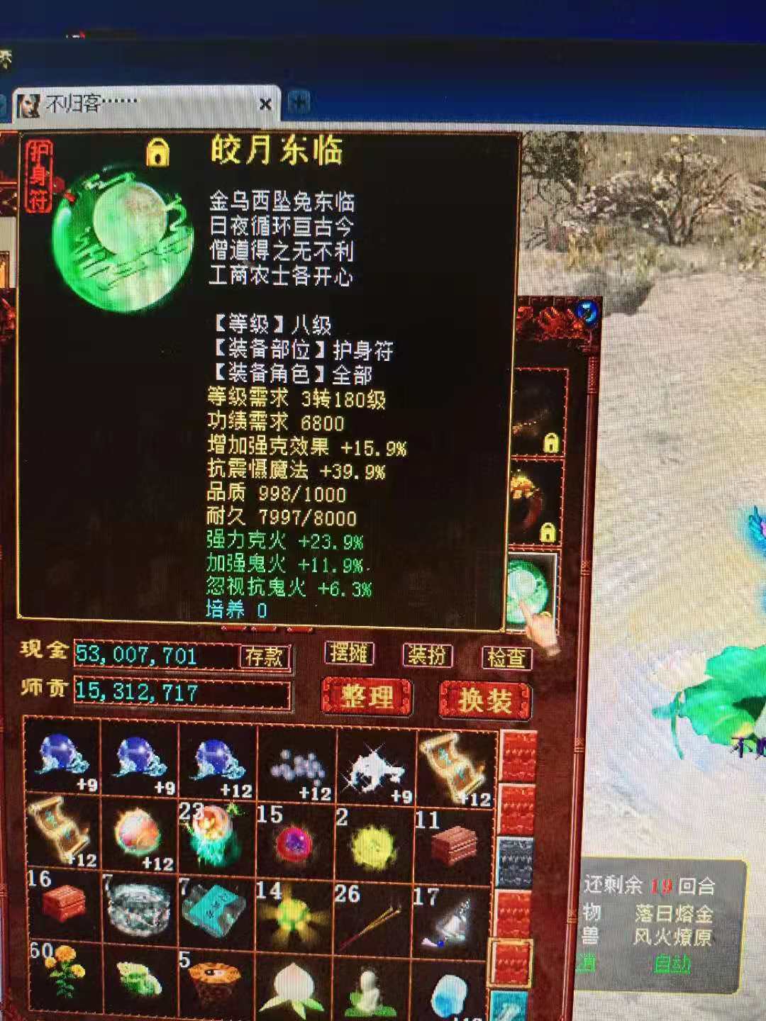 在看装备之前,首先提一下非仙器鬼的特点,非仙器武器是没有忽视抗鬼火这一项属性的。这项属性除了高级装备上的蓝字和星卡、护身符、宝石会带,其余就是仙器了。但是如果不是为了PK的话,基本不用考虑仙器武器,因为现在的游戏对于怪物抗鬼火的设定非常“仁慈”,当然一些高端副本对面上盘(鬼)的话,忽视抗鬼火还是有用处的,但是不用仙器用高装的话,最基本的石头加护身符,也可以到忽视15左右,当然如果有蓝字装备,属性会更高。忽视鬼火问题一会再说,先来看这位老铁的装备搭配。