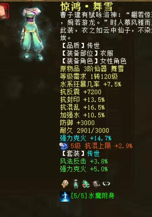 看下面这把四阶武器,用来打造程度炮简直是不二之选!单武器就加了32.1%的水系狂暴几率,加上项链提供的18点狂暴,衣服上还有7.5,最后再吃个33点狂暴的天谴符文,综合起来绝对是神挡杀神,魔挡屠魔! 炼器水爆22.1%的四阶水法武器