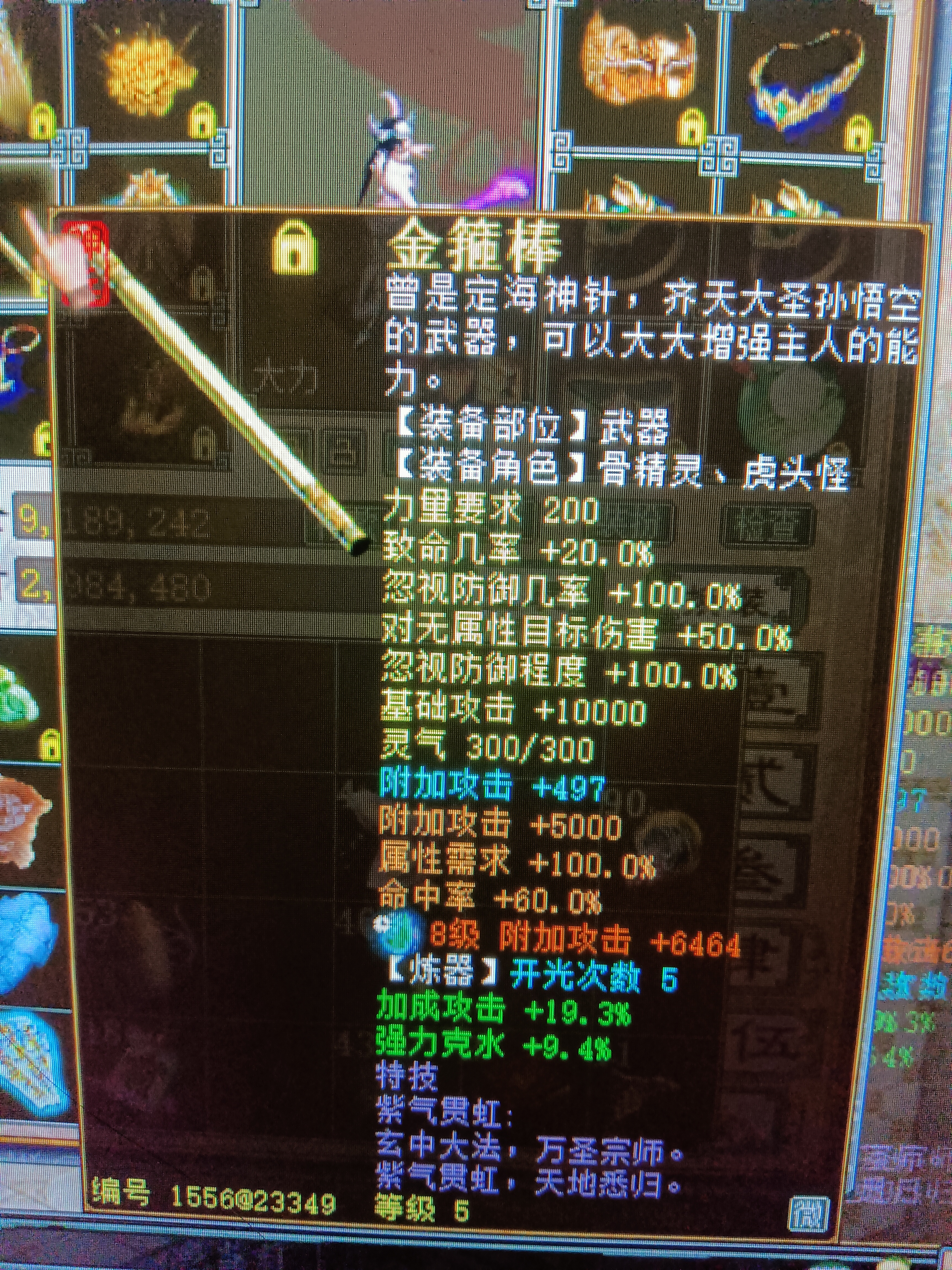 武器是一件五级破物理的“金箍棒”,底子致命几率20,蓝字附加攻击、炼器加成攻击19.3,这件武器的炼器还在继续打造,8级宝石攻击6464。衣服是一件16级,炼化加成攻击33、强力克水26,套装安排上了金麟,套装炼化加成攻击。鞋子是4阶仙器,属性:蓝字附加攻188,项链是4阶大力仙器,蓝字附加攻击141。