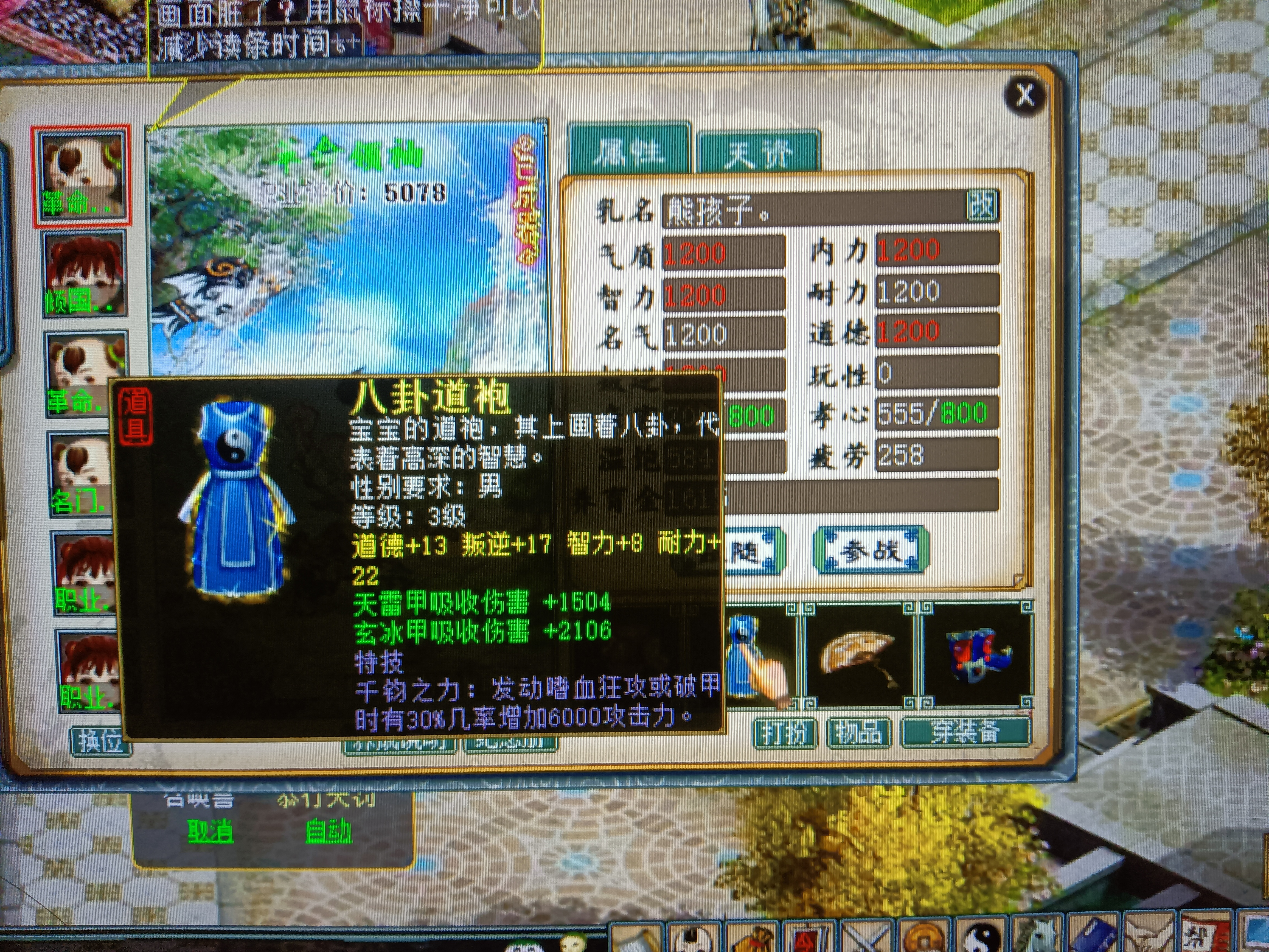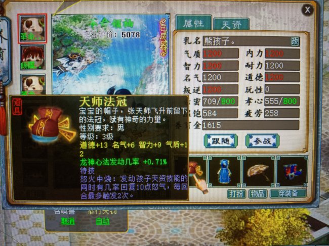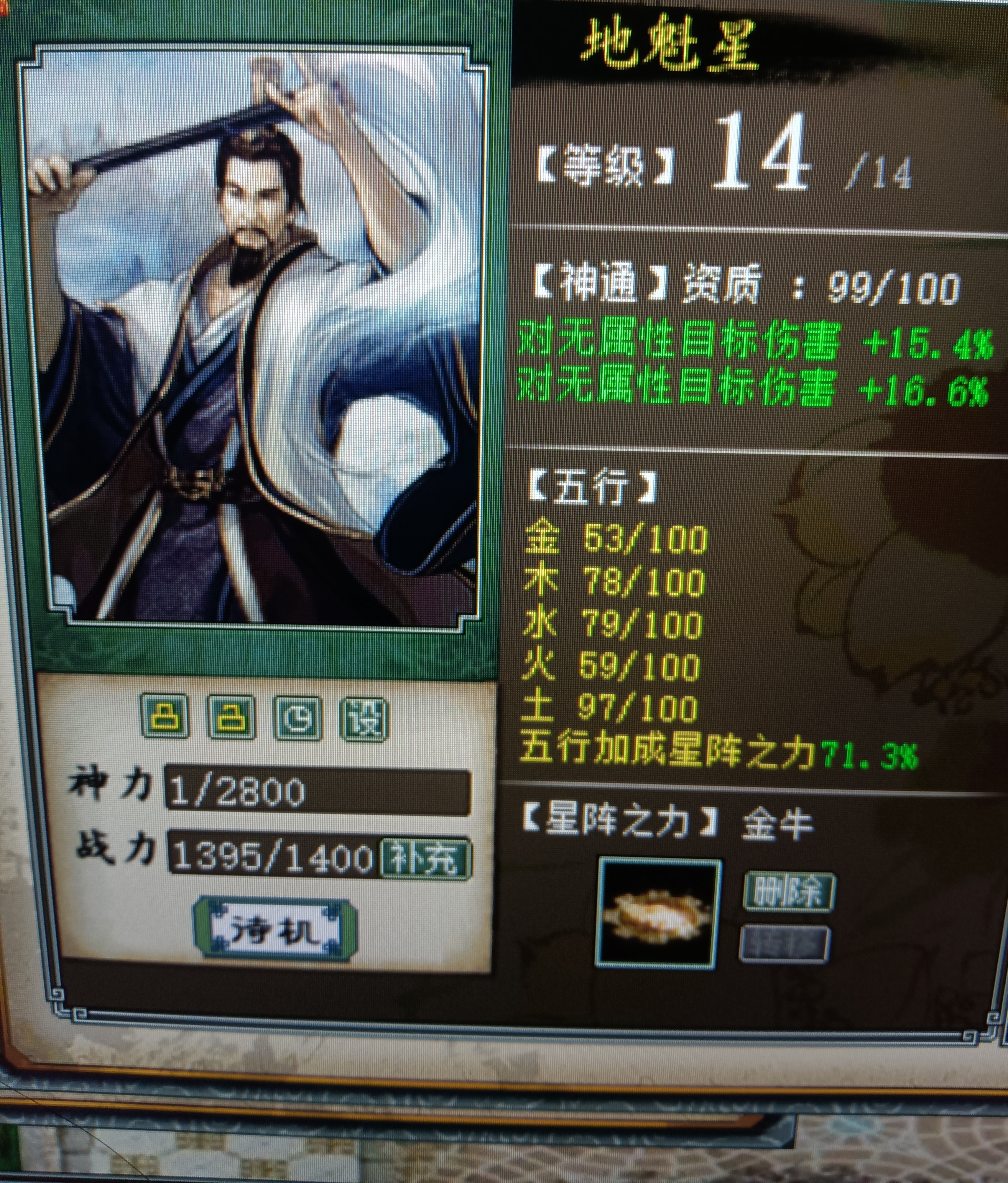 星卡是一张14级“地魁星”,金牛星阵加成谁用谁知道。99资质无属性伤害,佩饰上的套装属性也是全部洗的加攻击属性,5078全满孩子,装备均带有特技,细节非常棒。