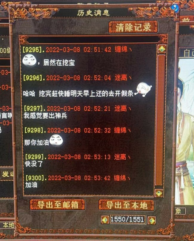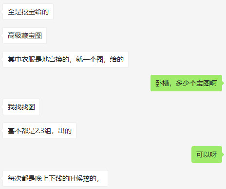 看来这是一位长期沉浸在挖宝领域的“专家”级玩家,其总结的小规律有两点: 1.神兵是2-3组出一个,这是自己总结出的概率; 2.时间点上,我都选在晚上下线前的时间,基本就是12点~1点。 至于这位玩家的经验到底靠不靠谱呢?看在上面那些神兵的份上,大家觉得是不是可以尝试下? [编辑:纳兰德骑士]