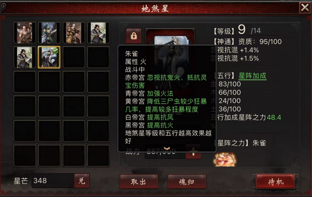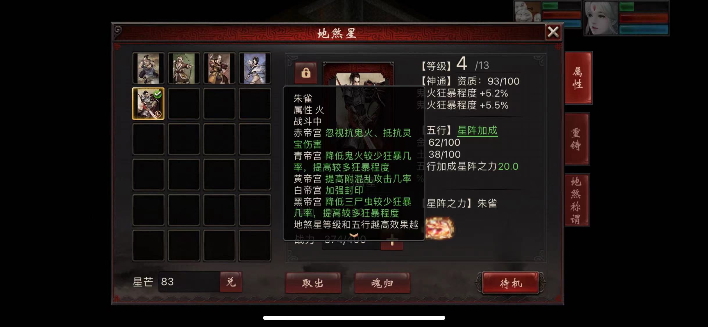 然后过了没几天想玩输出,新买了个小号女鬼,星卡买了第一天洗了五十次不到又洗出来一个朱雀,而且宫位更极品。 女鬼小号又出朱雀星阵