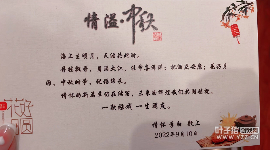 一位十里桃花服务器《情怀》帮派的玩家前来投稿,说自己的帮派正在抽取中秋礼品,他在帮派尚公堂抽到月饼和普洱茶叶后,特来叶子猪对帮主“李白”表示感谢! |