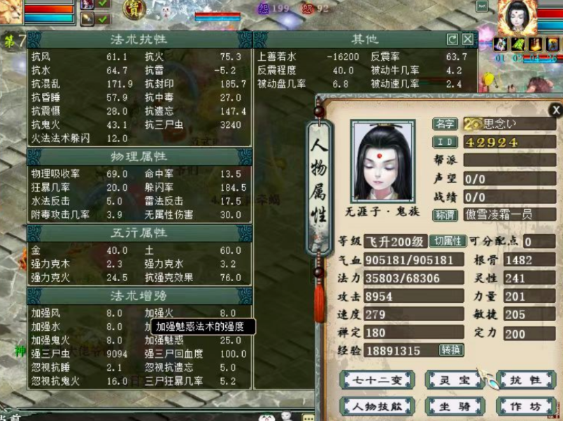 今天为大家展示一位来自傲雪凌霜的霄汉男鬼,飞升200级满,进战斗时气血高达90万,一起来看看他的装备搭配吧! |
