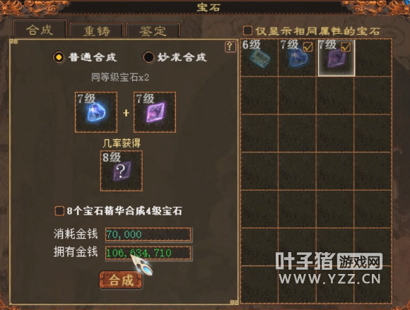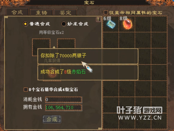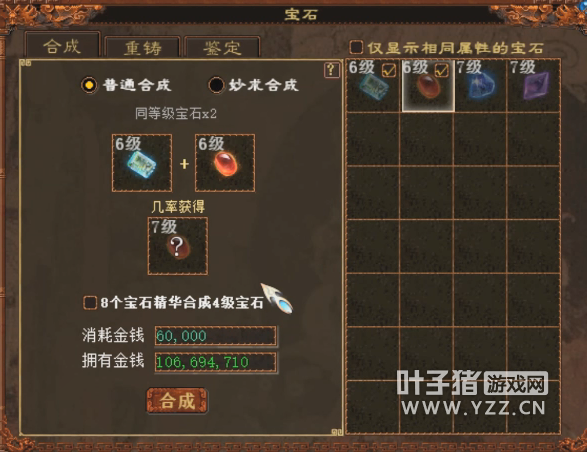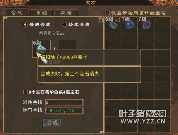 一玩家攒了两颗6级宝石,两颗7级宝石,今天准备试试手气,来看看最终结果如何? 碎一颗6级,合出一颗8级宝石,老铁们觉得他今天运气如何? [编辑:qodjc]