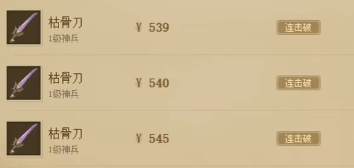 一老铁想要入手一把五级破物理神兵,但收了半天没收到合适的,一怒之下就以单件500多元的价格,买了三把一级神兵,随后就找到何大雷,看看能冲到几级! |