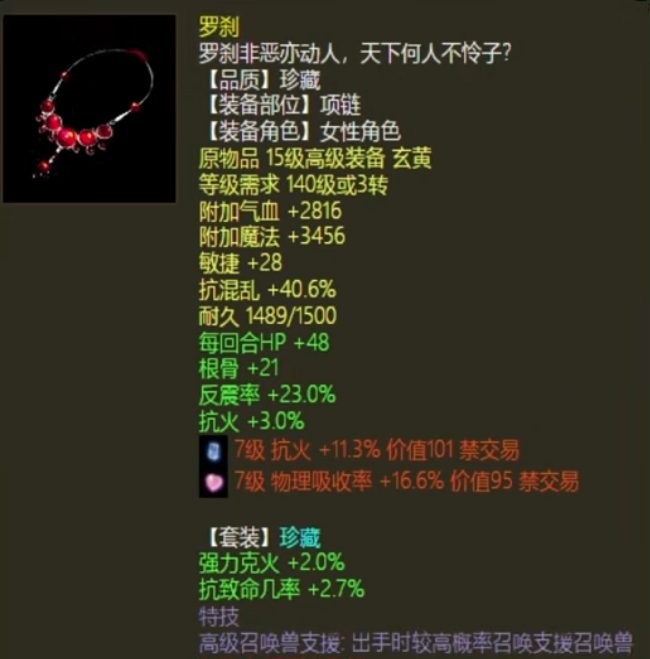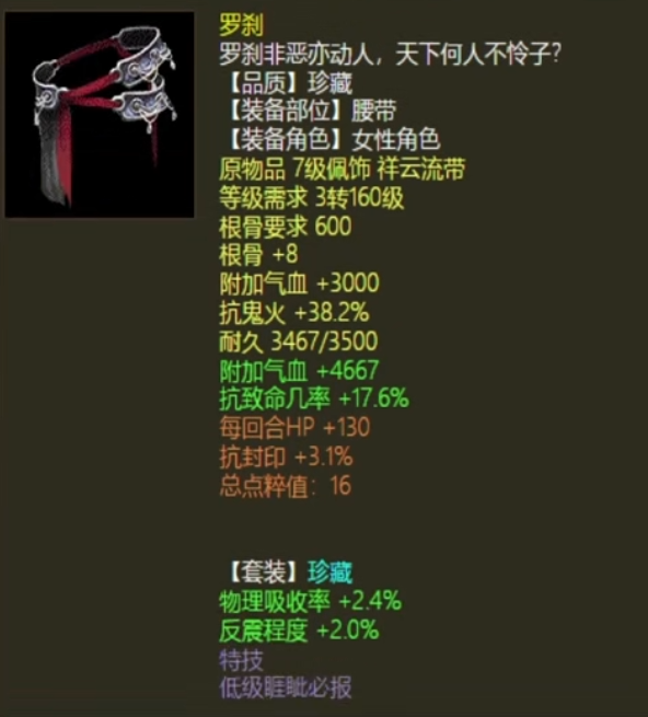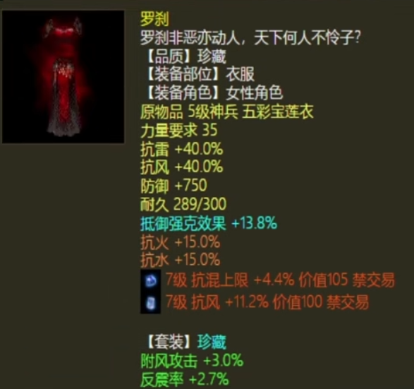 为了在帮战和天梯中表现得更好,今天这位大话西游2女魔专门配了一套装备,选择五阶仙器是为了提升强盘,再加上敏血鞋子和神兵衣服,多抗属性也安排得妥妥当当,一起来欣赏! 如果预算只够入手一把五阶的话,这位女魔就做了很好的一个示范,兄弟们不妨参照她的搭配来试试! [编辑:294duj]