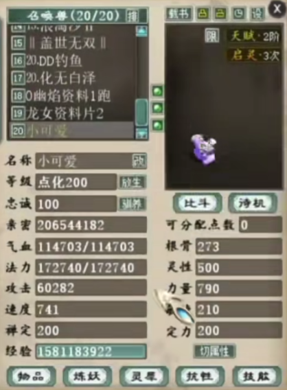 盖总的大话西游2双终极松鼠已经趋于完美,身上携带有化无夺魂两大神技,但为了要一个隐身技能,这位大神今日又开始吃圣兽啦,而且全程不吃万兽,只吃圣兽! |