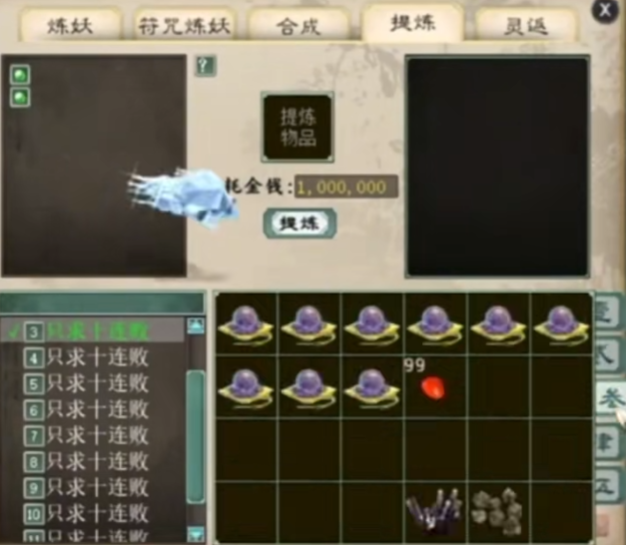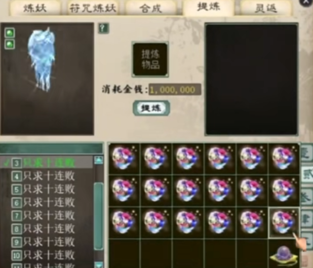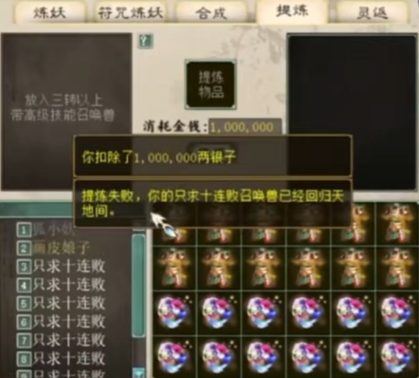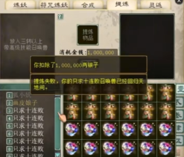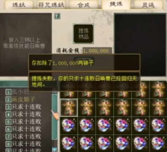 这位兄弟准备提炼十只大话西游2召唤兽,但奇怪的是,他给这十只宝宝都起名叫“只求十连败”,这是为了迷惑表哥吗?还是反向奶自己一口呢? |