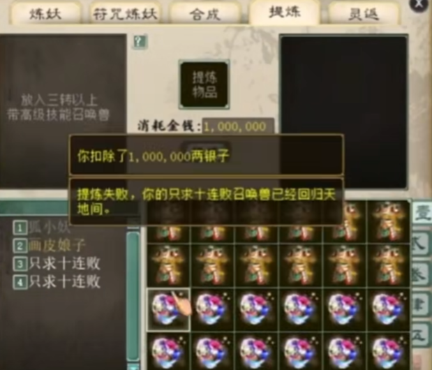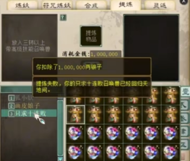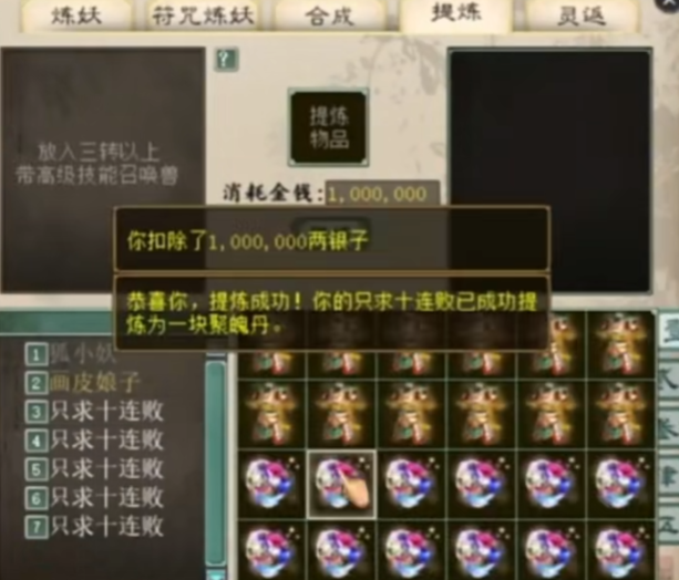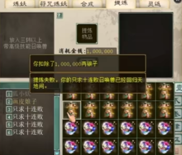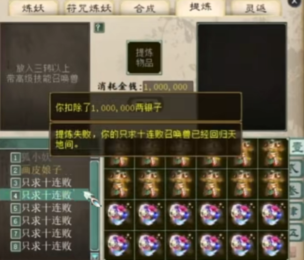这位兄弟准备提炼十只大话西游2召唤兽,但奇怪的是,他给这十只宝宝都起名叫“只求十连败”,这是为了迷惑表哥吗?还是反向奶自己一口呢? 差点就成了十连败了,看来这招不太管用啊,下次试试改成十连胜? [编辑:09sike]