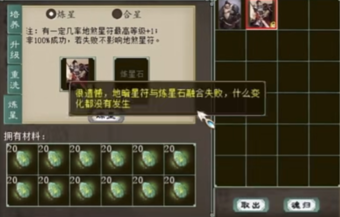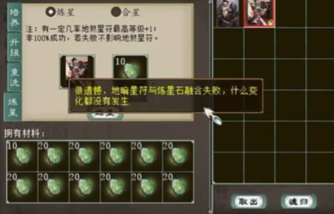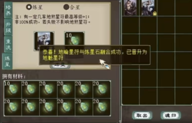 玩家准备升级大话西游2青龙星卡,但据江湖传说,青龙星卡好像是最难上的一种,没关系,咱们今天来摆个阵破除魔咒! 也没有很难嘛!大家记住了吗,下次就把炼星石这样放,三次就能成功! [编辑:092kdie]